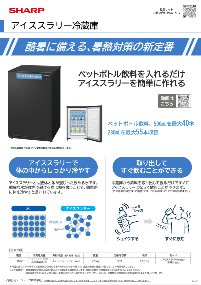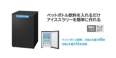 本製品は、体の芯から効率よく冷やすことができる「アイススラリー(微細な氷が混ざった飲料)」を、市販のペットボトルから手軽に作ることができる画期的な冷蔵庫です。